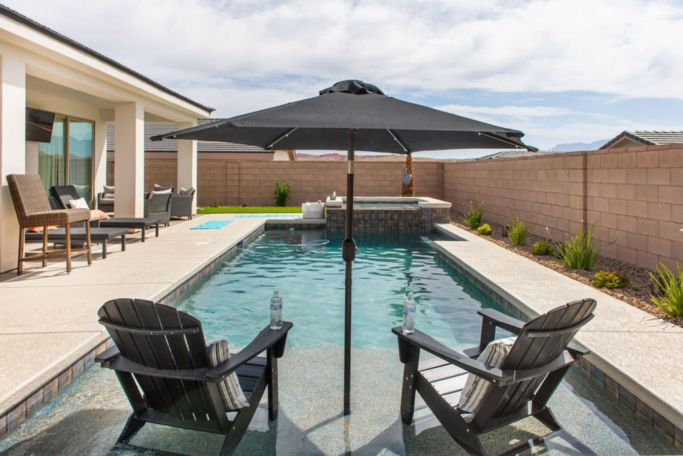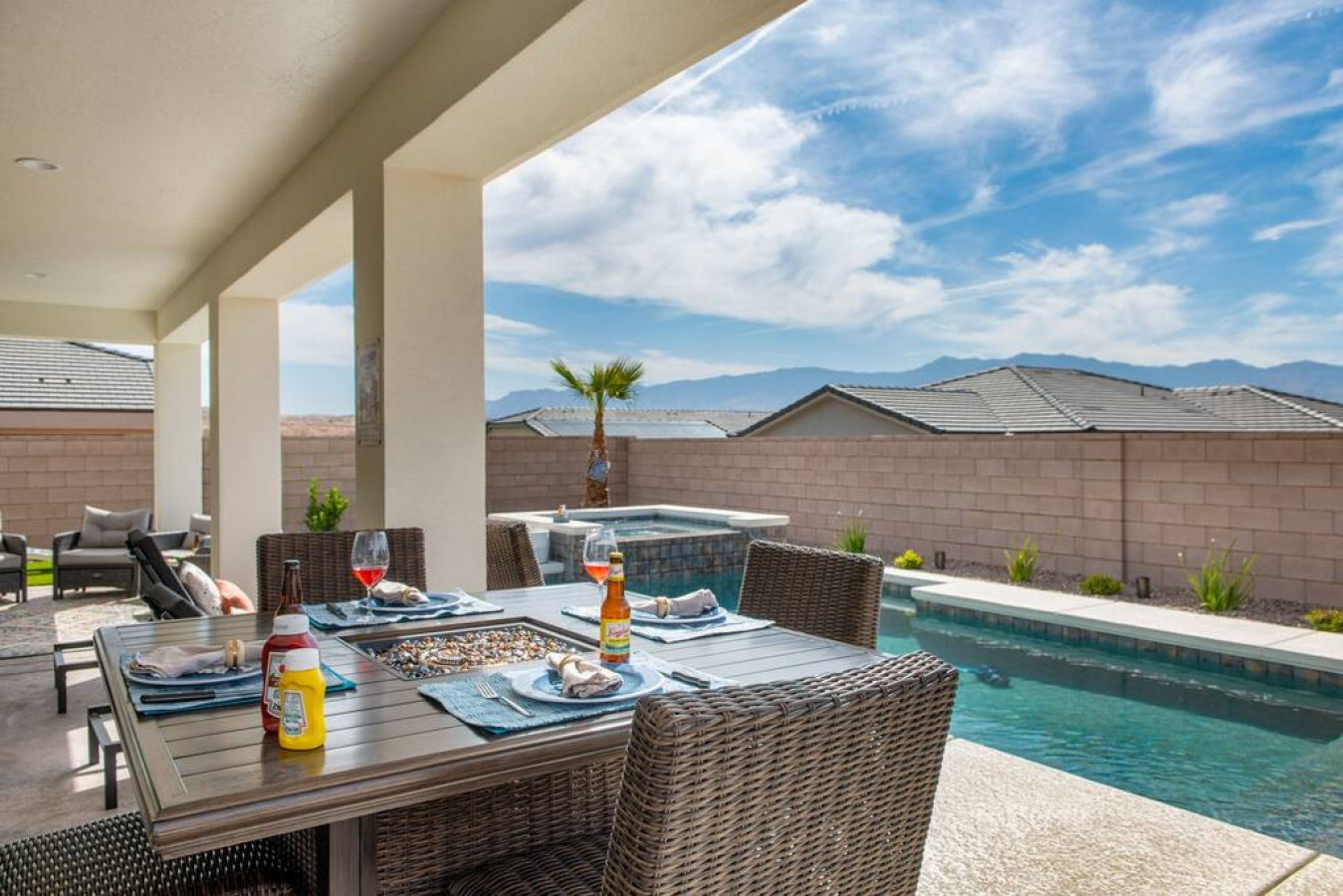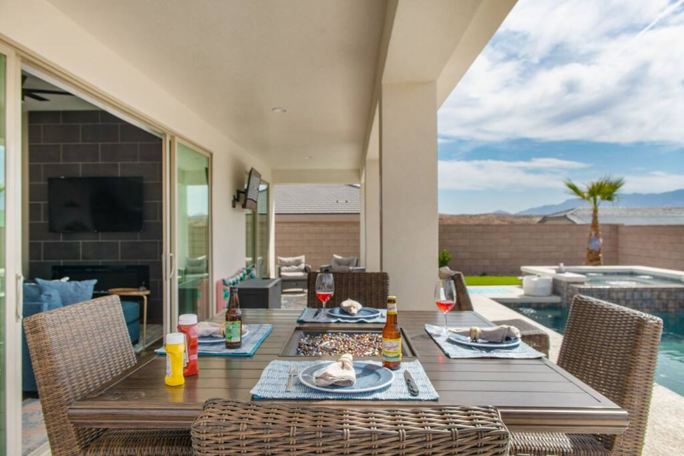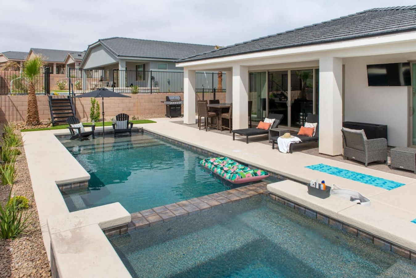 +1 (509) 881-7250Escape to a 3-bed vacation haven with pool, spa, and desert views. The backyard oasis offers a TV, outdoor seating, firepit dining, BBQ, and loungers for sunbathing. Play yard games, then snuggle by the indoor fireplace on chilly evenings. Large sliding doors seamlessly blend indoor and outdoor living. Beautifully furnished and stocked kitchen. An adjoining property is available for larger groups. A perfect 4-season getaway!