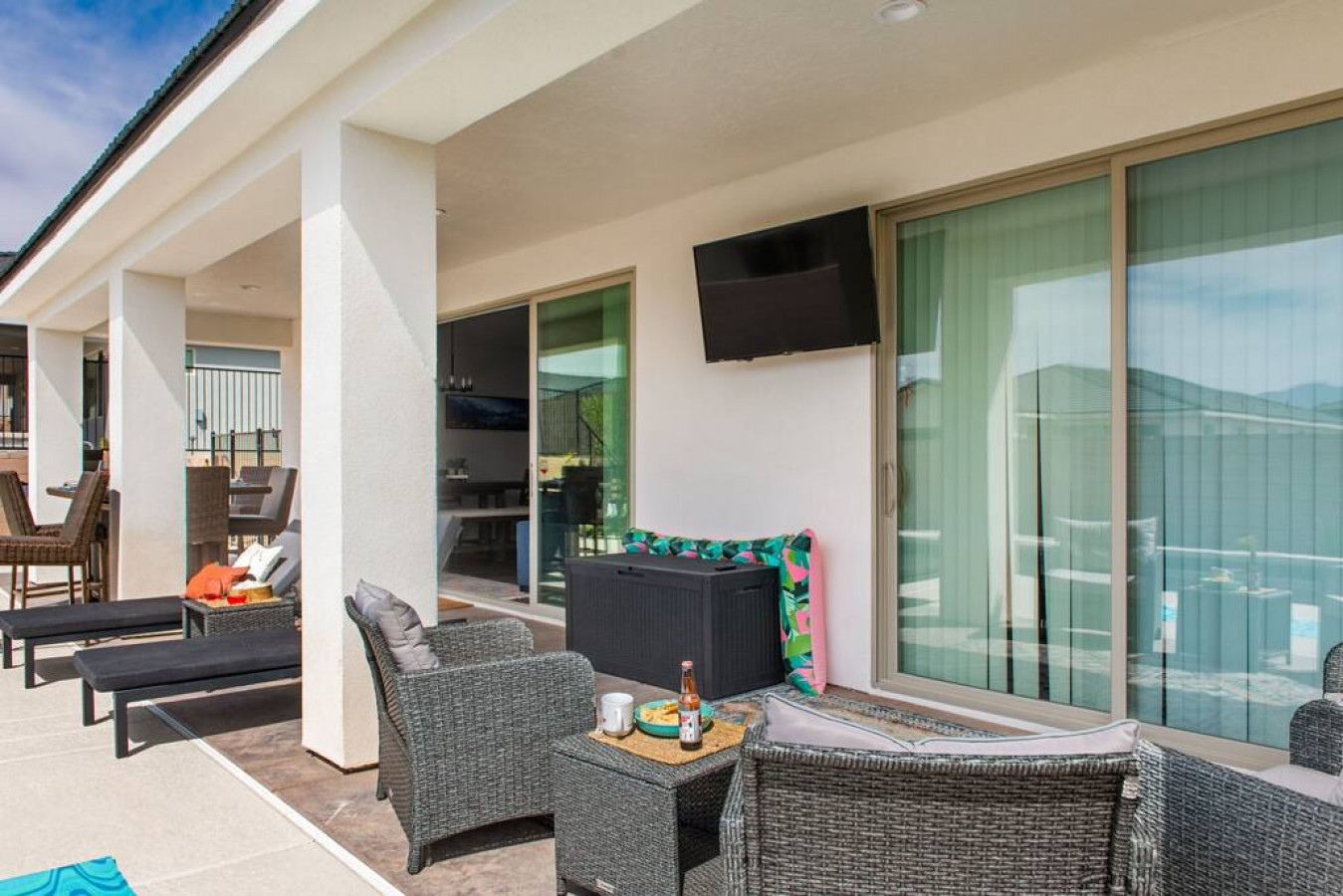 LOUNGE AREA: Lounge chairs and a conversation set with TV offer comfortable additional comfort in the backyard.