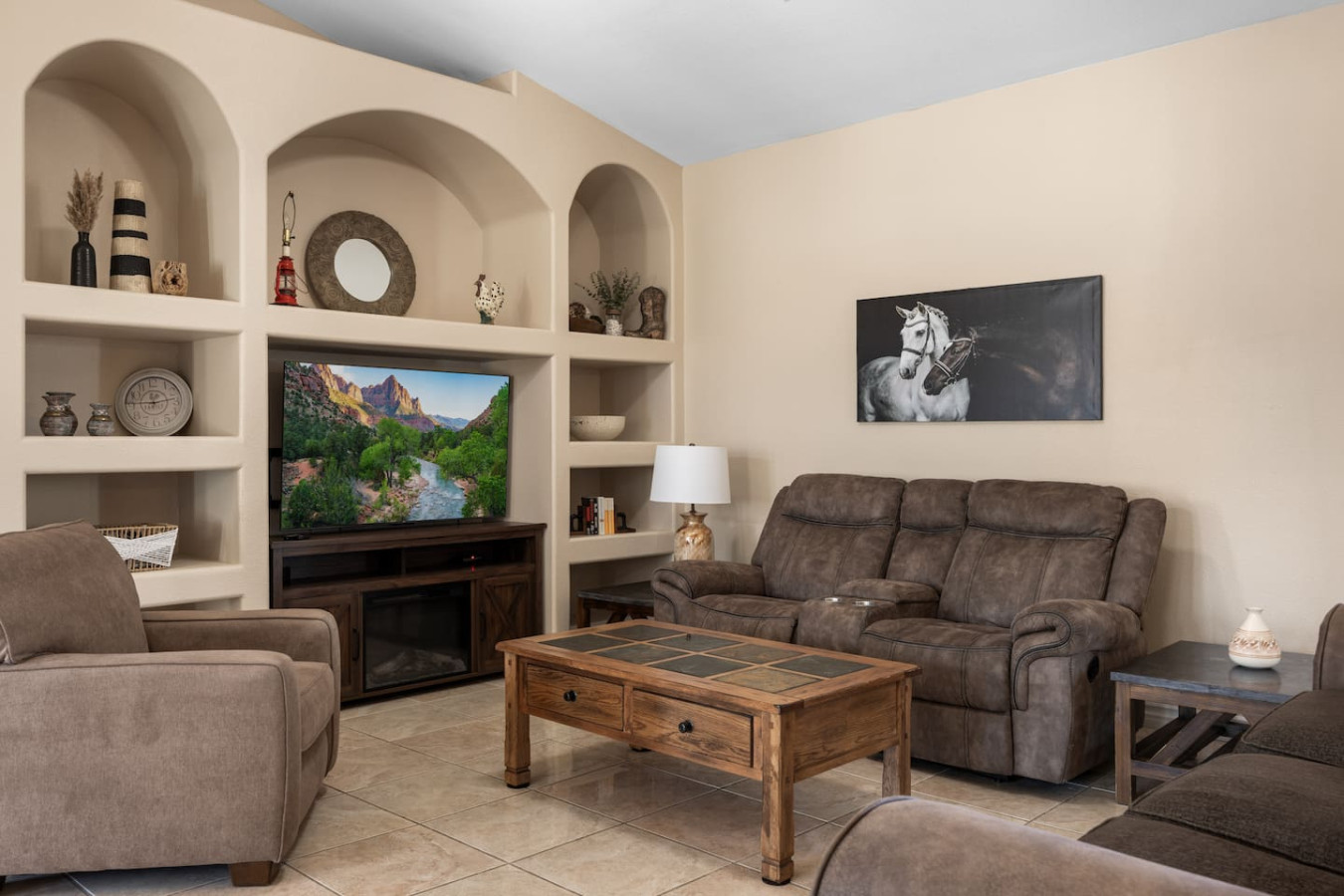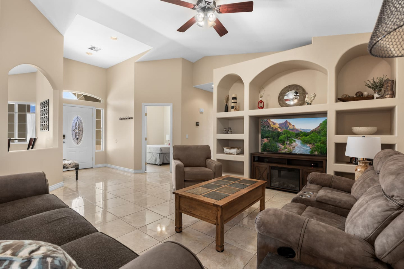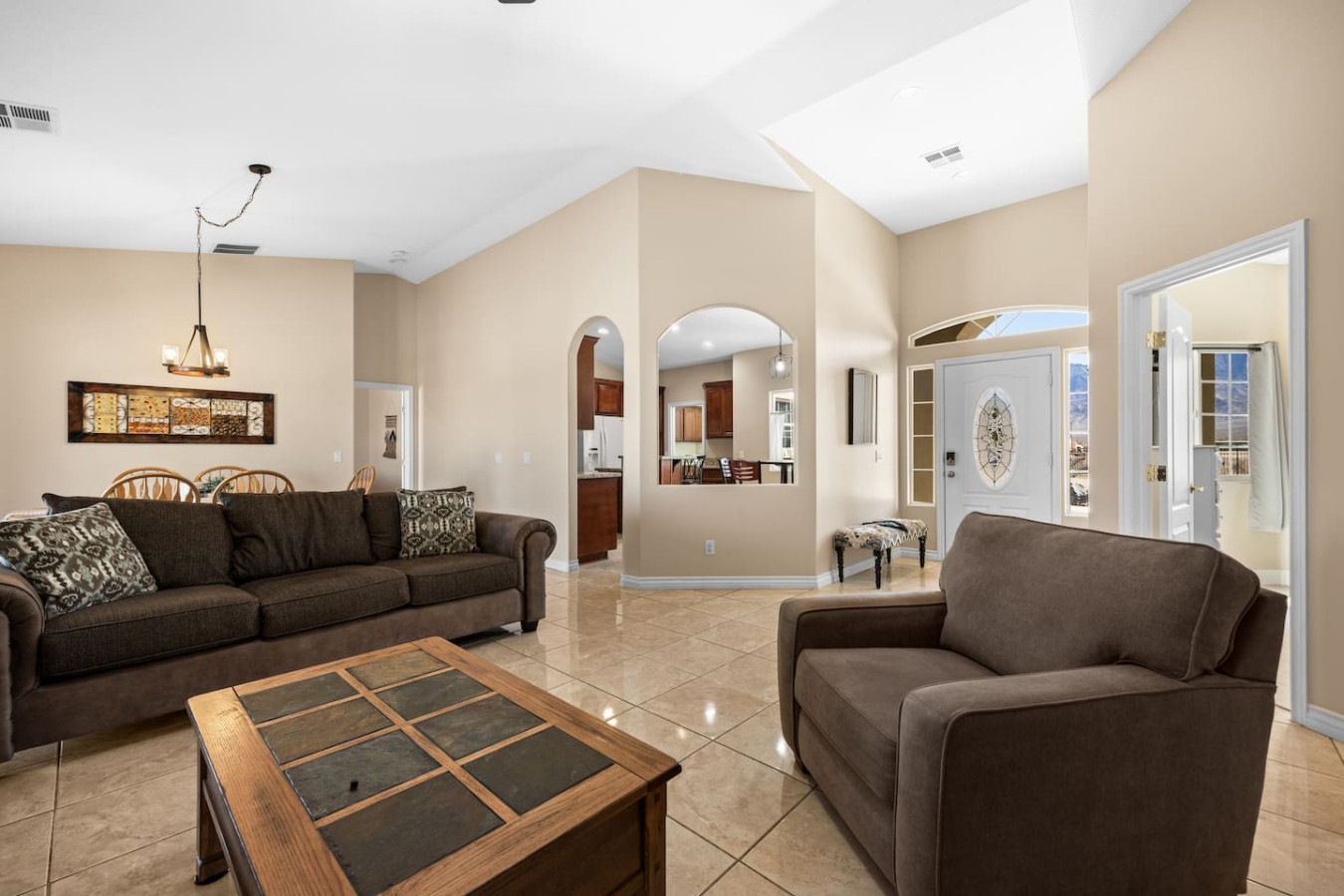 Living room: Unwind after a day of adventure in the comfortable, spacious living room. With an open-concept layout, the kitchen, dining room, and living room flow seamlessly, allowing everyone to enjoy the space together. Watch your favorite shows on the smart TV or gather around the dining table for a fun family game night. Step through the sliding door to a large patio, where you can relax in outdoor seating enjoying the desert air, and cook dinner on the propane grill.