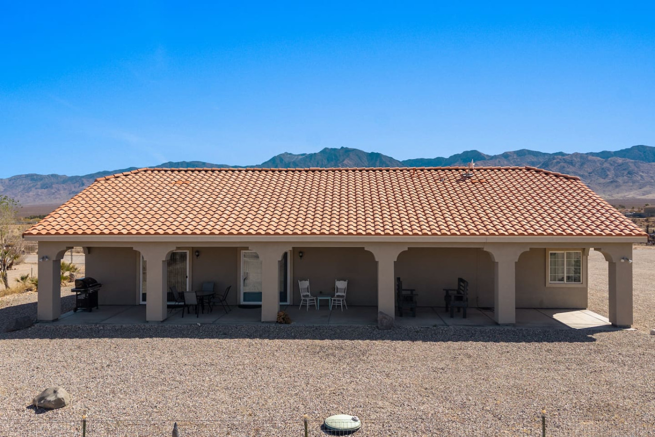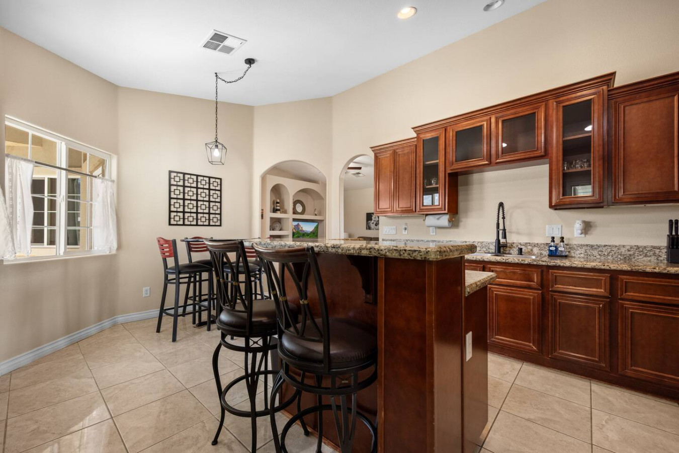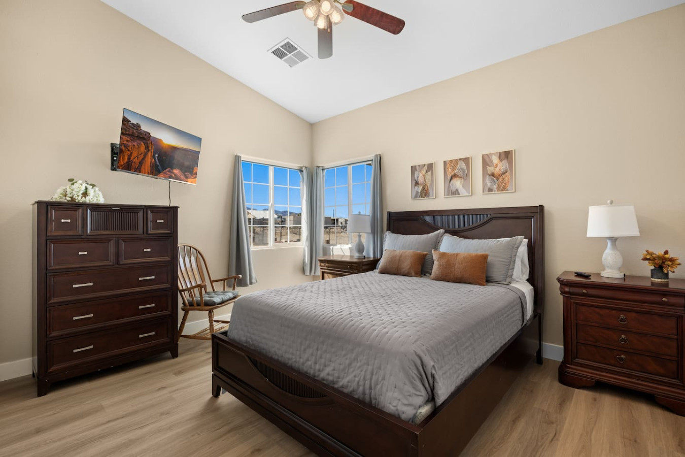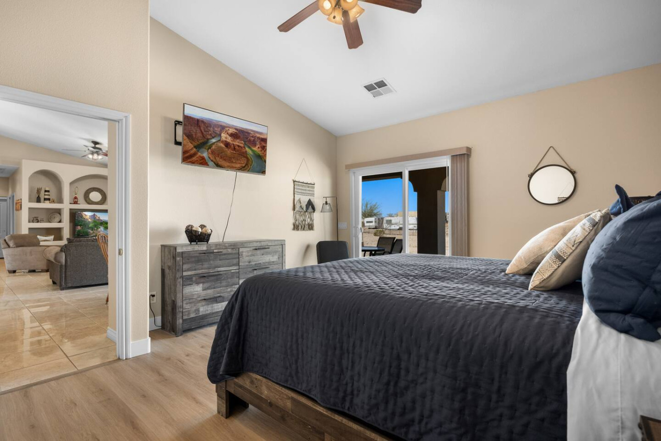 Living room: Unwind after a day of adventure in the comfortable, spacious living room. With an open-concept layout, the kitchen, dining room, and living room flow seamlessly, allowing everyone to enjoy the space together. Watch your favorite shows on the smart TV or gather around the dining table for a fun family game night. Step through the sliding door to a large patio, where you can relax in outdoor seating enjoying the desert air, and cook dinner on the propane grill.