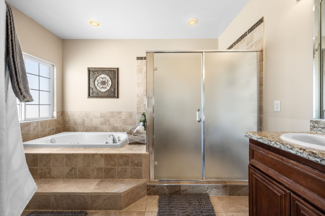 Bathrooms: The primary ensuite boasts a luxurious standalone shower, a jetted tub, and a walk-in closet. The second bathroom is spacious, featuring a shower/tub combo. Both bathrooms are fully stocked with abundant towels, shampoo, conditioner, body wash, lotion, and more, so you can pack light and enjoy a stress-free stay.