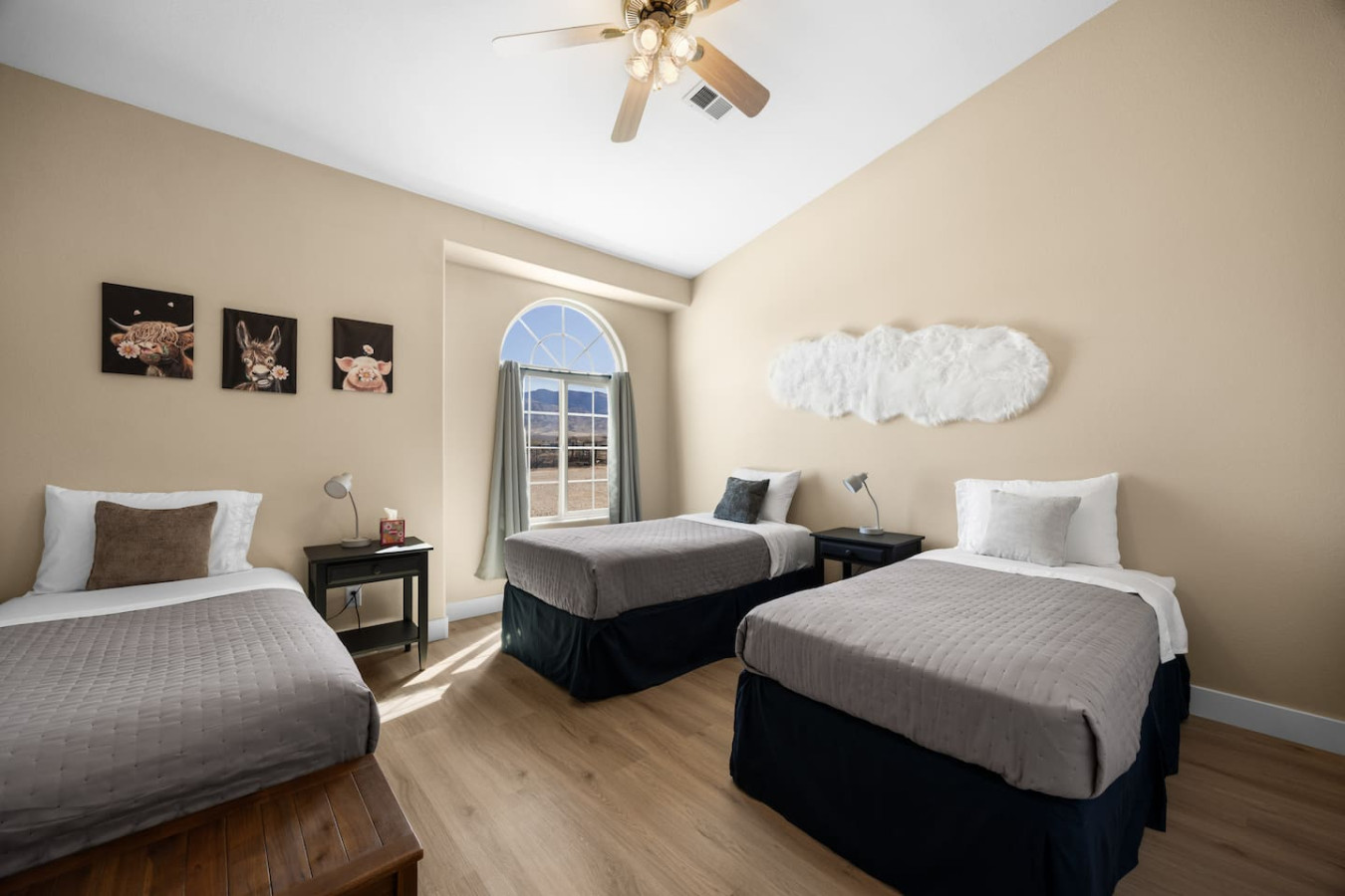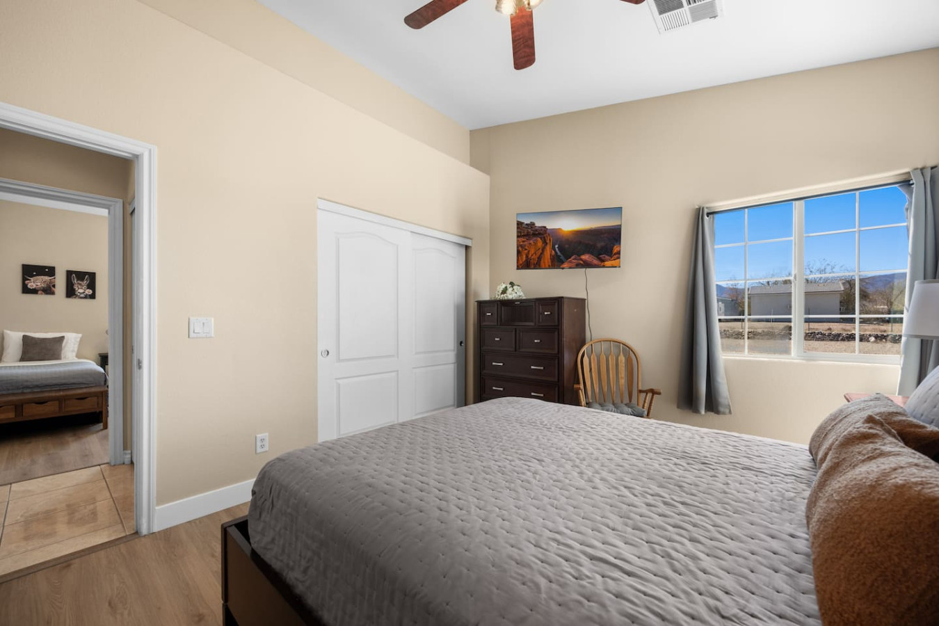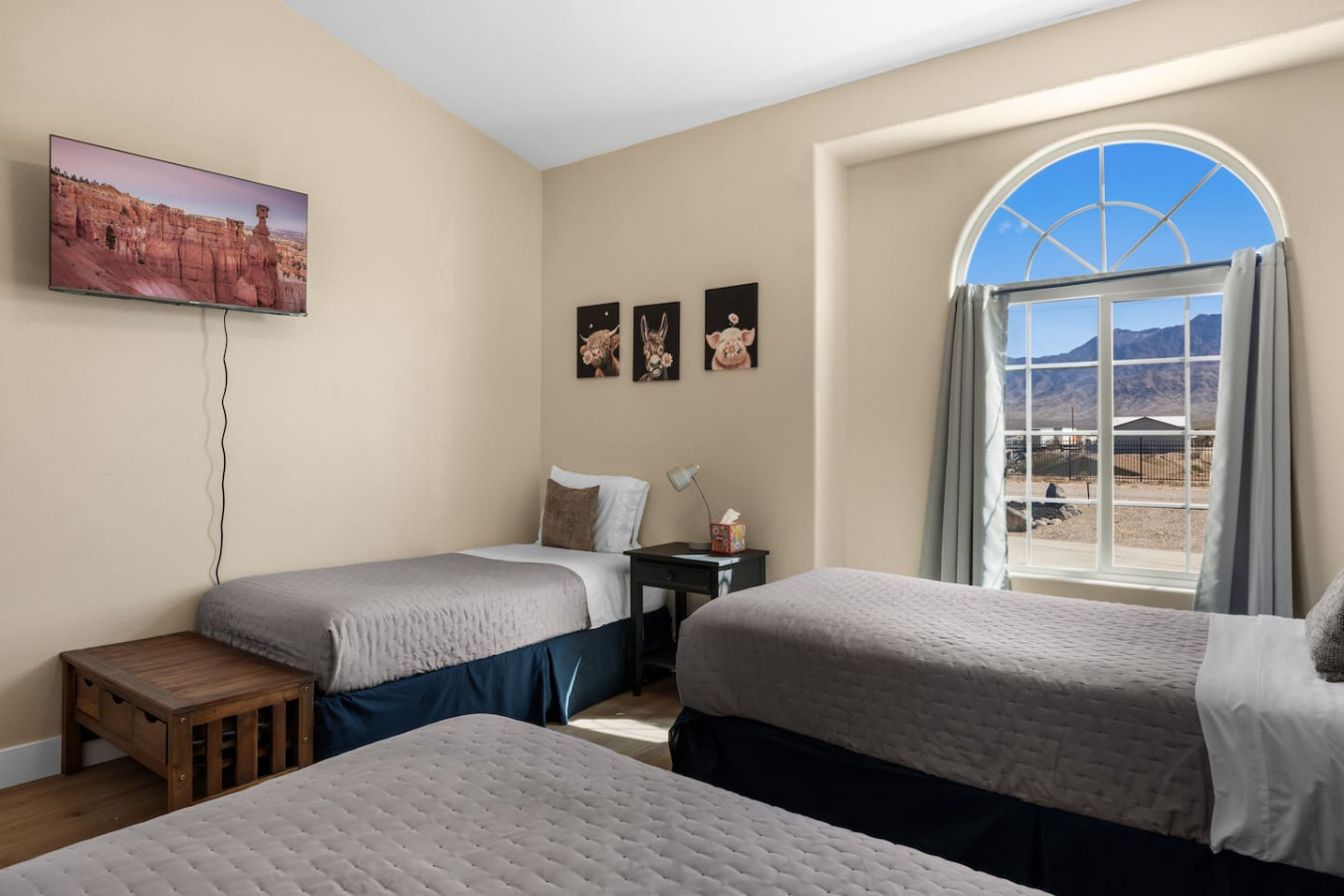 +1 (509) 881-7250Embark on a desert adventure at this spacious 4-bed, 2-bath home, sleeping up to 10. Located in a country town (ten minutes from Mesquite) surrounded by mountains, you'll have easy access to UTV trails, a fenced area for horses, an RV hookup, and ample parking for recreational trailers. Golfer too can relax in cozy rooms, enjoy a fully equipped kitchen, and take in stunning mountain and desert views from the property. Perfect for families or groups seeking outdoor fun and adventure. Book your stay today!