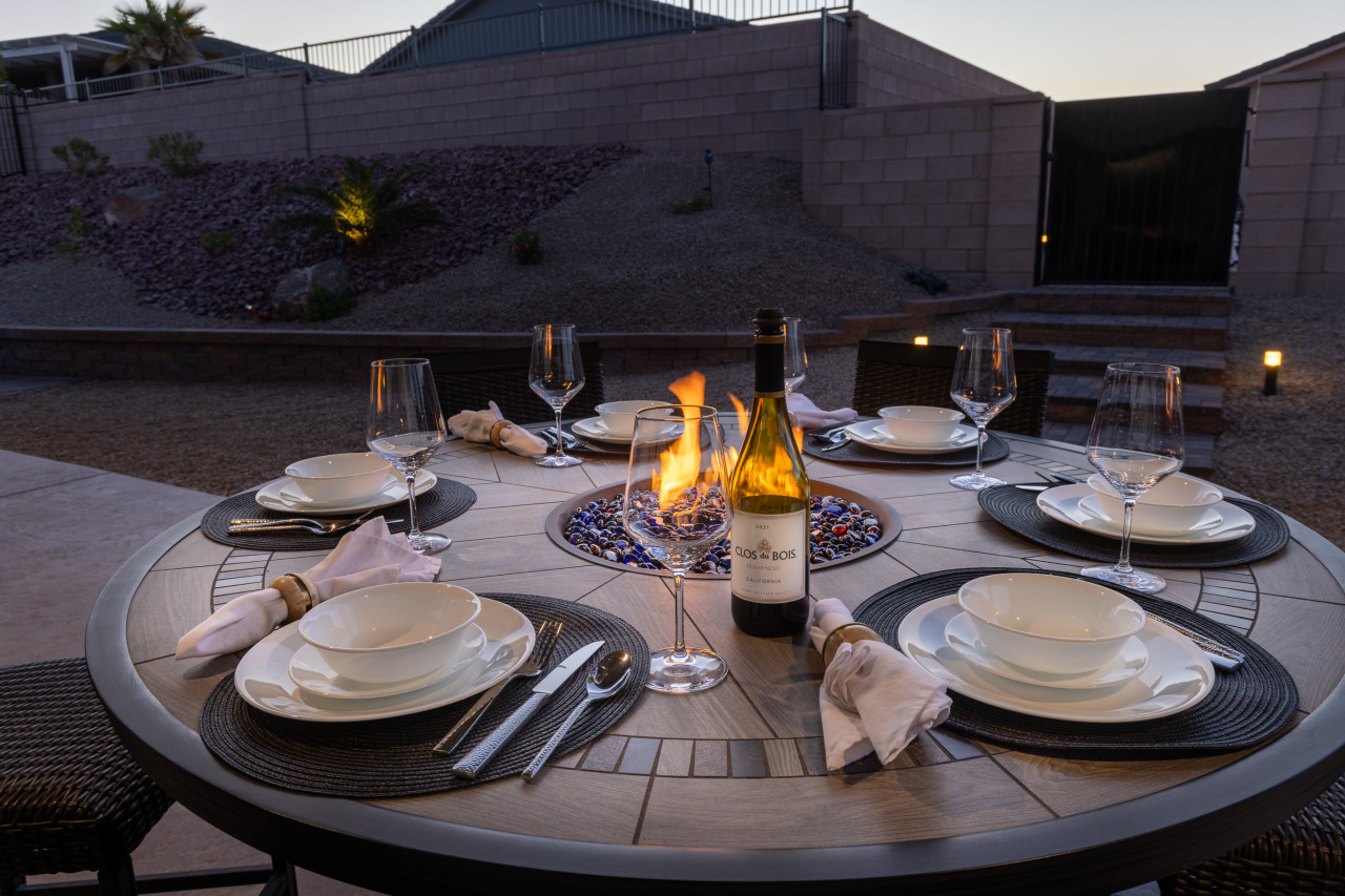 FIRE PIT AND DINING TABLE: Our bar height fire pit table is perfect for conversations, drinks and dinner as you stay warm in an inviting atmosphere.