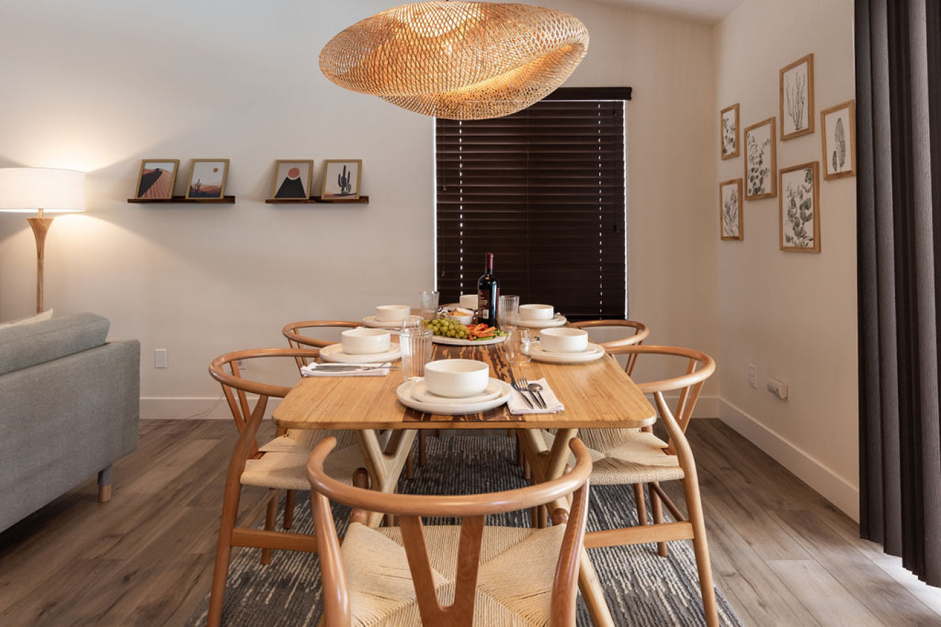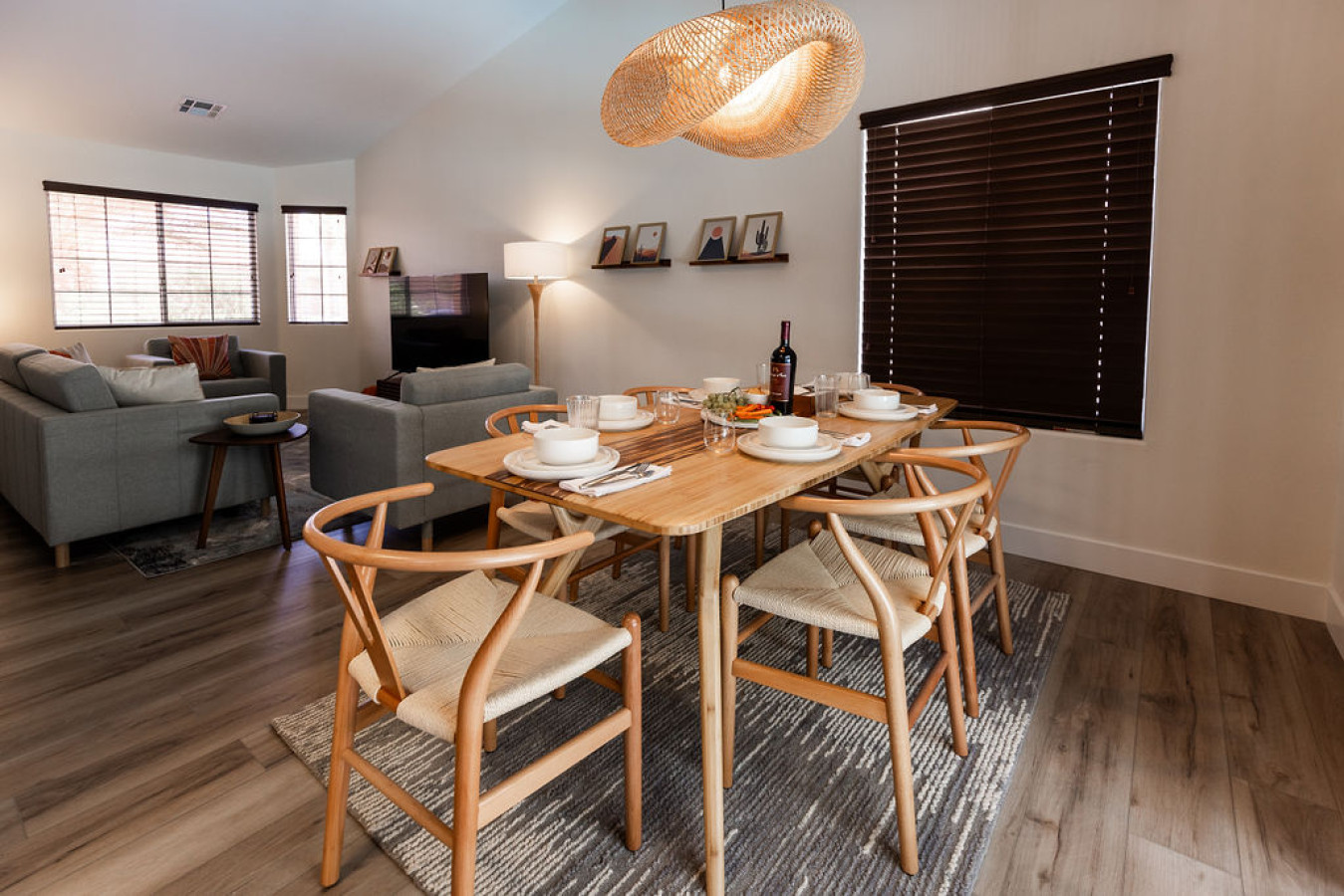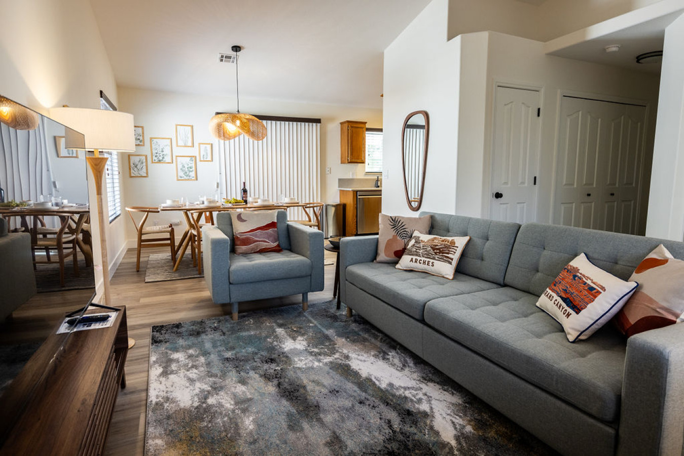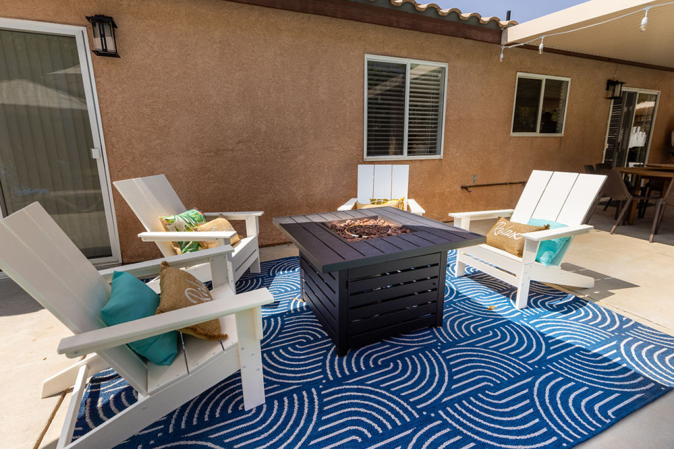 Living room: Step into a cozy living room designed by a real production design team, where style meets comfort. Enjoy your favorite shows on the Roku TV or gather around the stunning dining table that seats eight, highlighted by a unique light fixture. The sliding door seamlessly connects to a backyard with an indoor/outdoor living space, perfect for relaxing and entertaining.