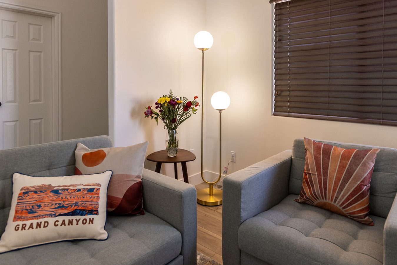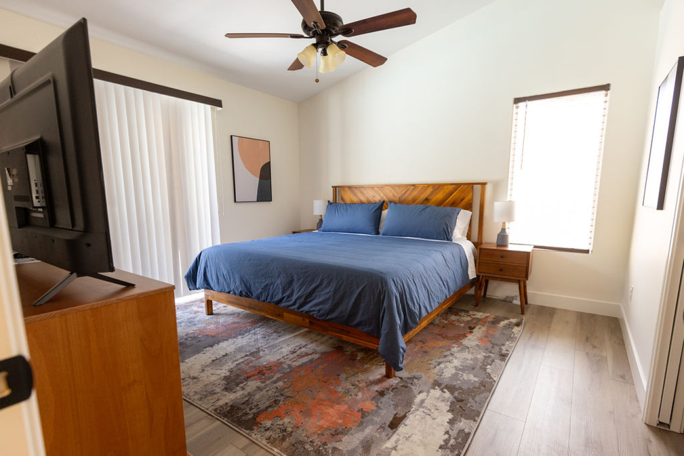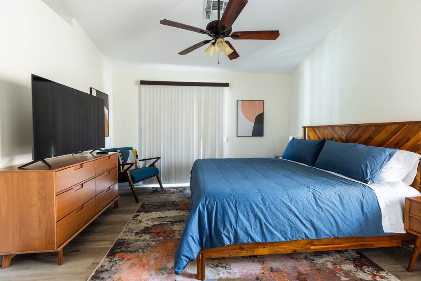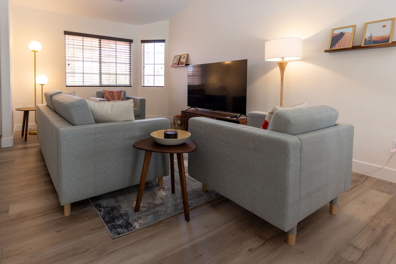 Living room: Step into a cozy living room designed by a real production design team, where style meets comfort. Enjoy your favorite shows on the Roku TV or gather around the stunning dining table that seats eight, highlighted by a unique light fixture. The sliding door seamlessly connects to a backyard with an indoor/outdoor living space, perfect for relaxing and entertaining.