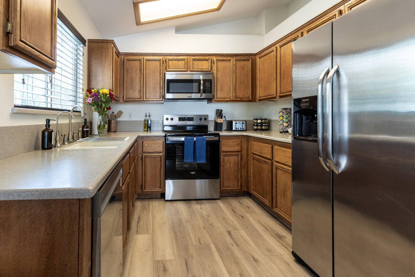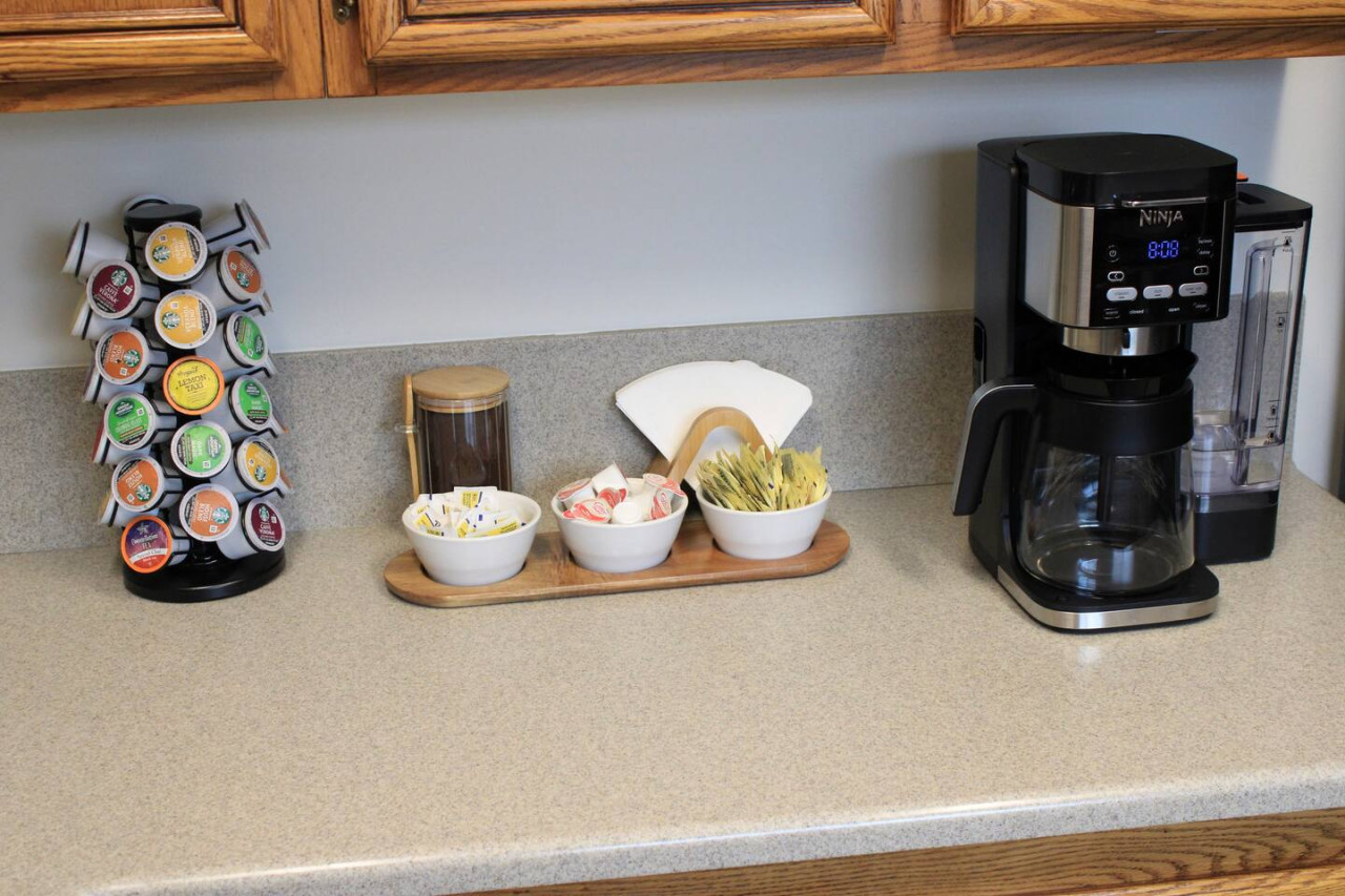 Kitchen: If you like to provide meals at home, this is the place to do it. Full cookware and some bakeware are provided. Beautiful indoor and separate outdoor dishes are for your use as well as coffee & filters, tea, spices, barbeque utensils and more. The coffeemaker makes fresh brewed coffee or utilizes pods – your choice!