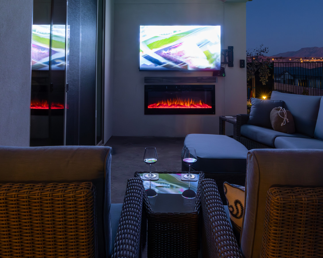OUTDOOR LIVING: An outdoor lounge/conversation set with TV and electric fireplace offer comfortable additional comfort in the backyard.