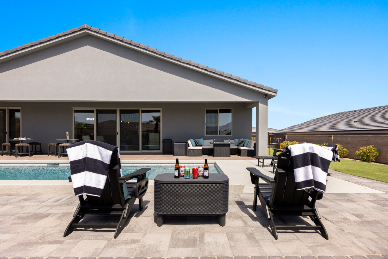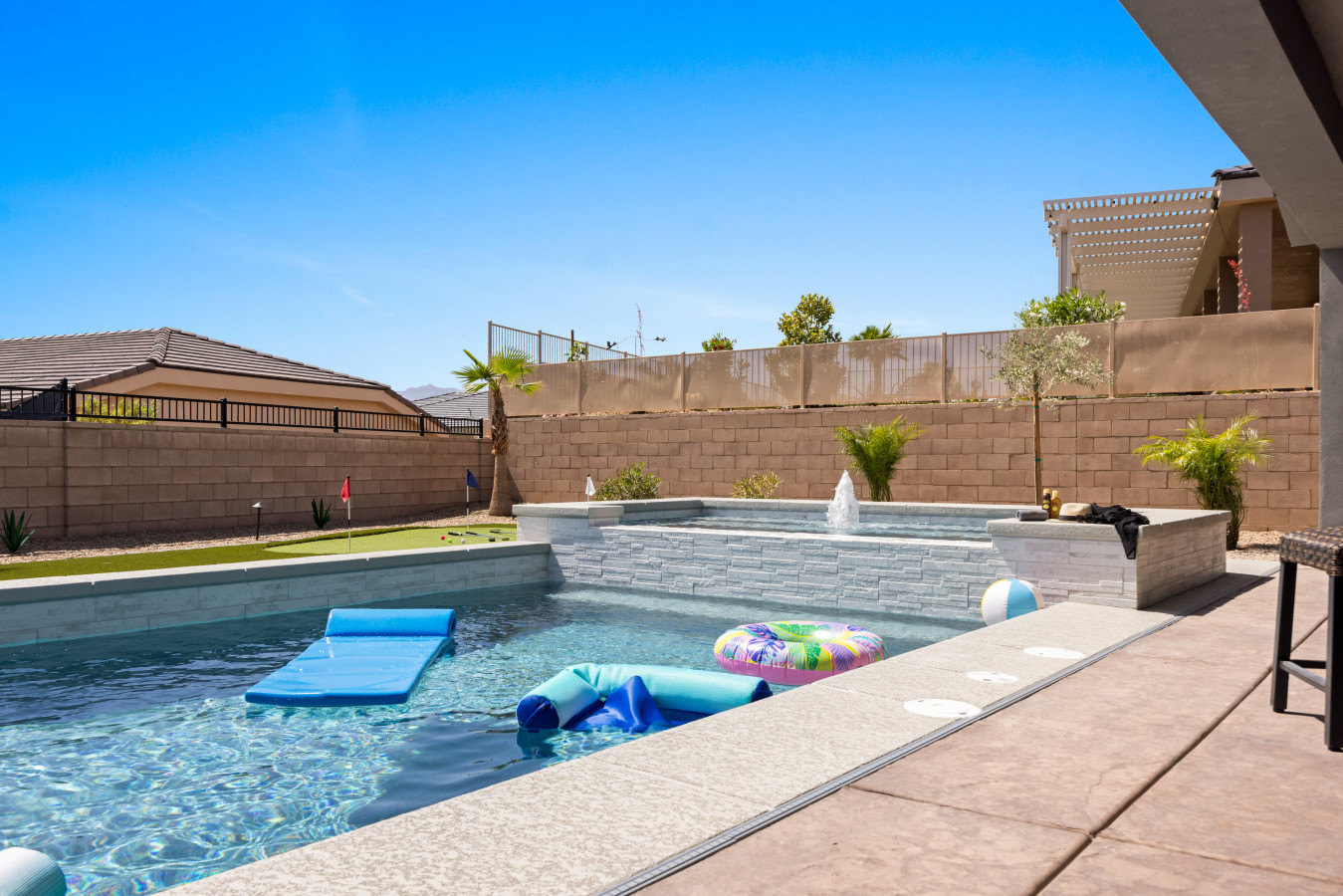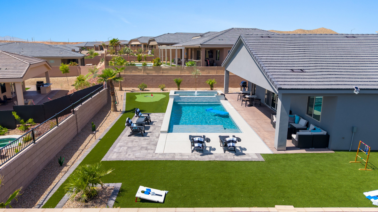 +1 (509) 881-7250Escape to this beautiful 4-bedroom home in Mesquite. Relax by the outdoor pool or unwind in the rare, 10 person hot tub with breathtaking mountain views and stunning sunrises. The spacious side yard is perfect for yard games, and the game room in the garage offers hours of fun. Bed configurations are flexible for individual sleepers. For larger groups, two partner houses next door are available. Close to world-renowned golf courses, UTV trails, gambling, and more. Book your vacation today!