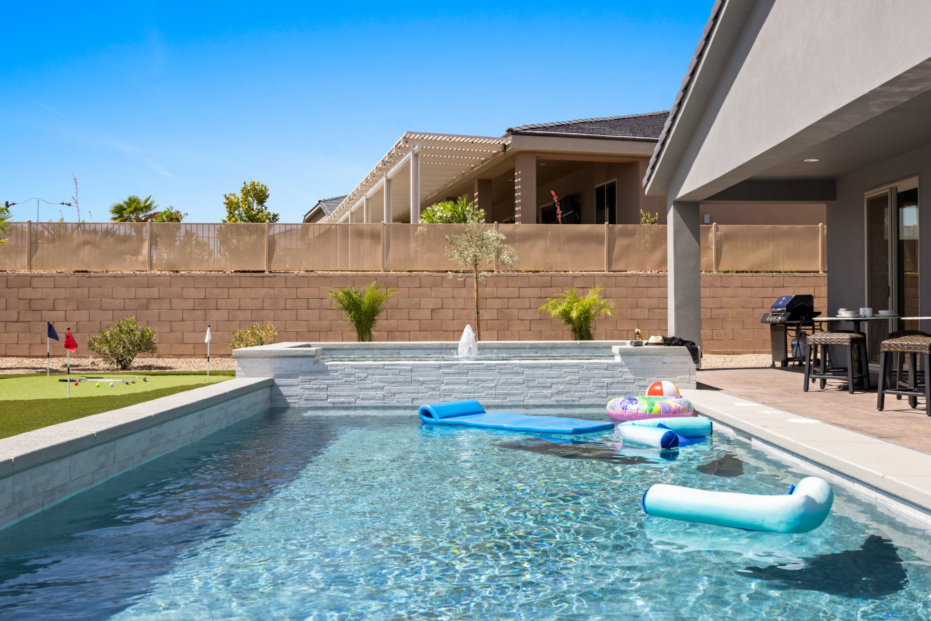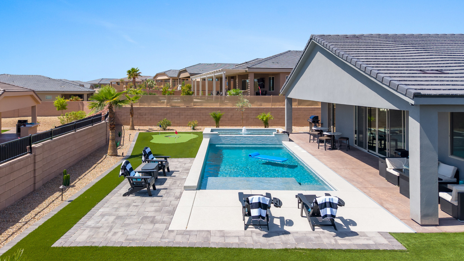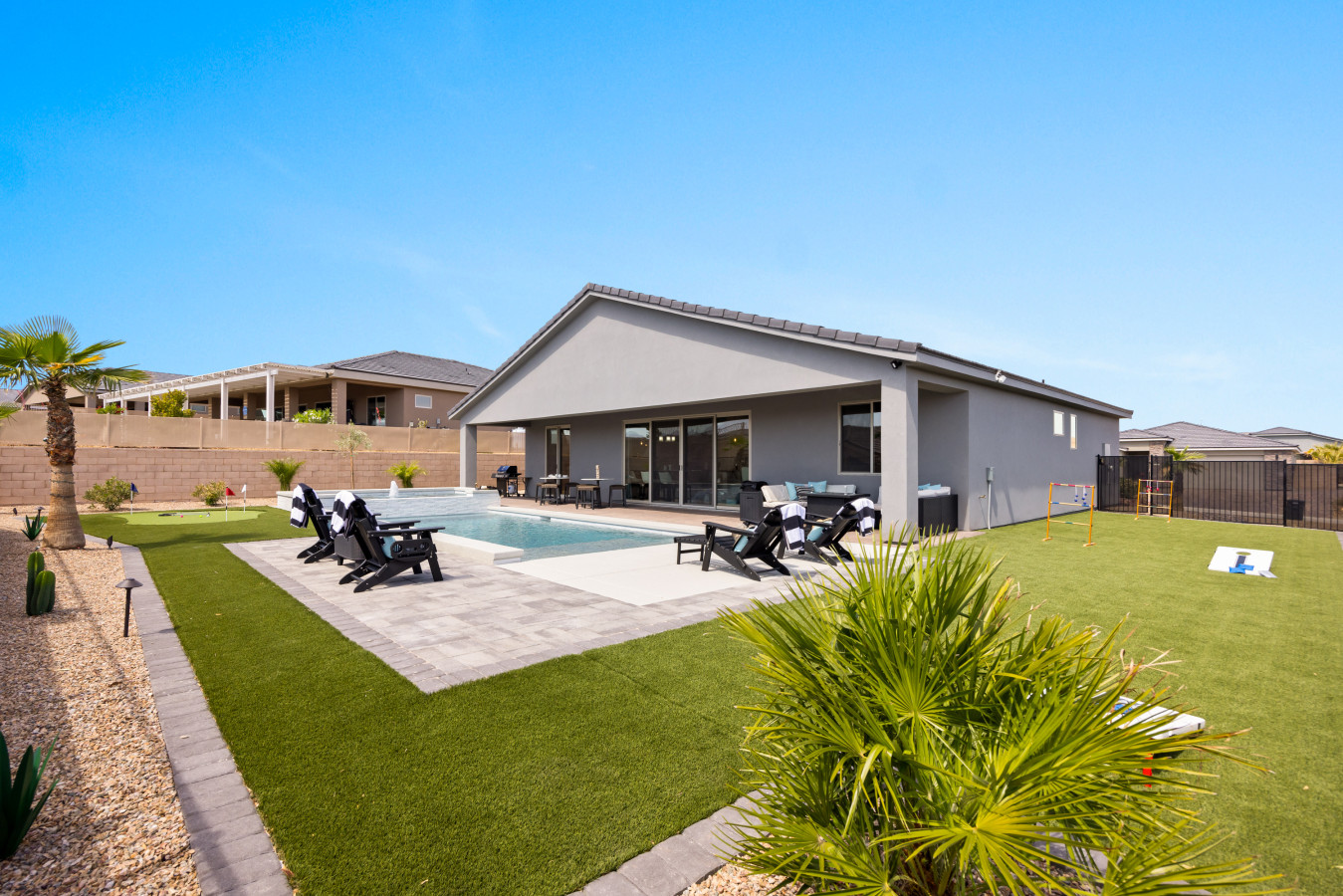 LOUNGE AREA: Lounge chairs and outdoor furniture offer additional comfort in the backyard.