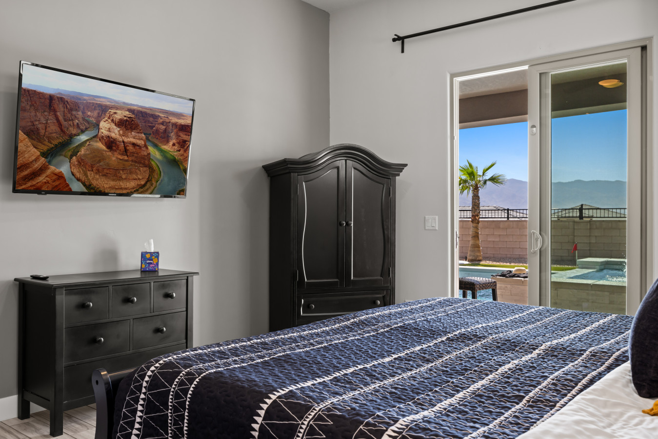 * By Nevada state law, we have to have a door alarm leading out to the pool. There is a bypass on the door that you can utilize as you go in and out. The alarm is VERY loud. Should you choose to take the battery out of the alarm, you do so at your own risk. If taken out, the batteries must be re-installed before you checkout Thank you.